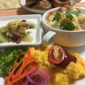 ホールオニオンのグラタンスープ、スクランブルエッグにレタスとピクルス、ヨーグルトとキウイフルーツにナッツ。