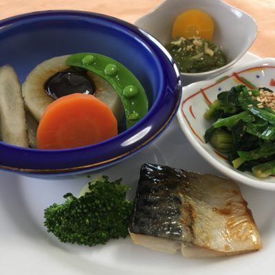 鯖の西京味噌焼とブロッコリー、ふろふき大根と根菜の煮物にエンドウ、ほうれん草のお浸し、メカブ酢に人参煮。