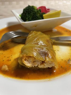 タンドリーチキンのロールキャベツ、ブロッコリーとレモンに紅大根のピクルス。