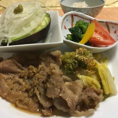 豚モモ生姜焼と蒸しキャベツ、菜花のお浸しにトマトとパプリカ、アボカドとオニオンスライス。