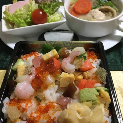 海鮮ちらし寿司、つみれ汁、ハムサラダ。