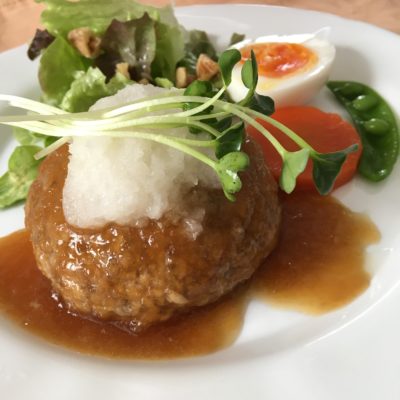 和風おろしハンバーグ、塩玉子にレタスとナッツのサラダ、人参煮とエンドウ。