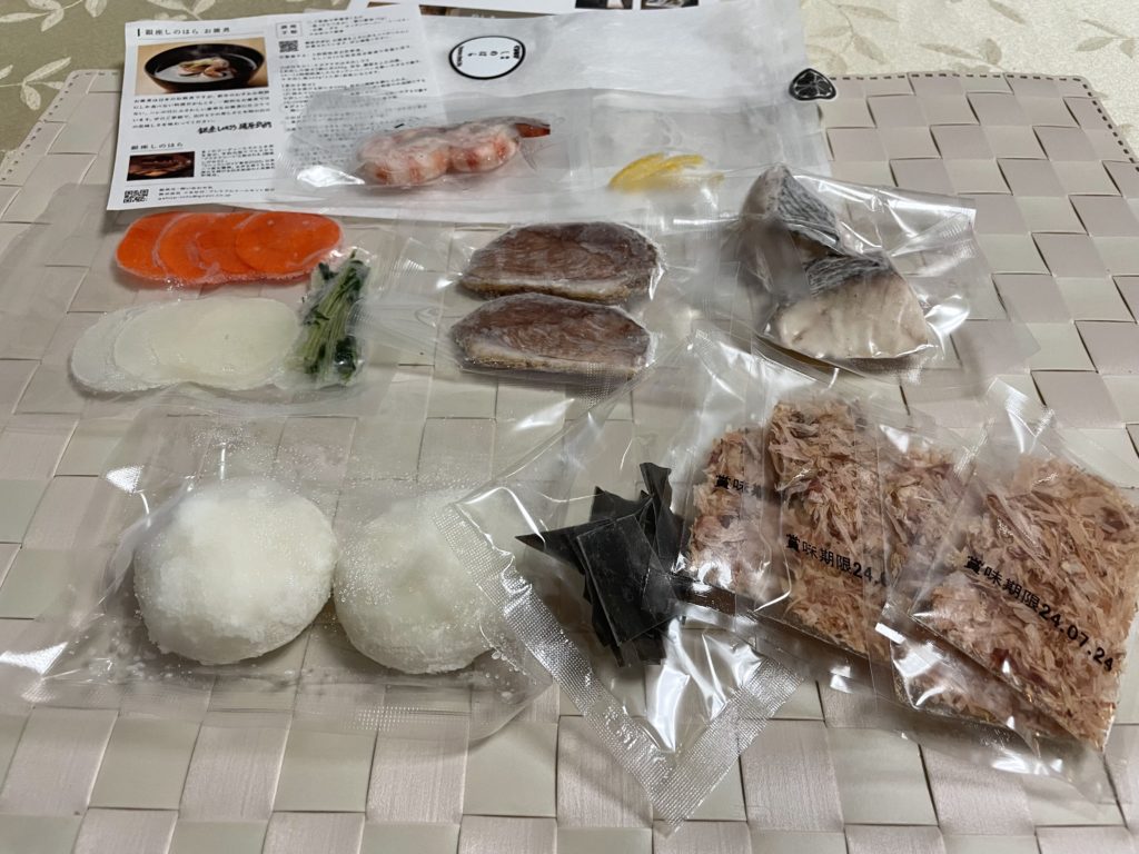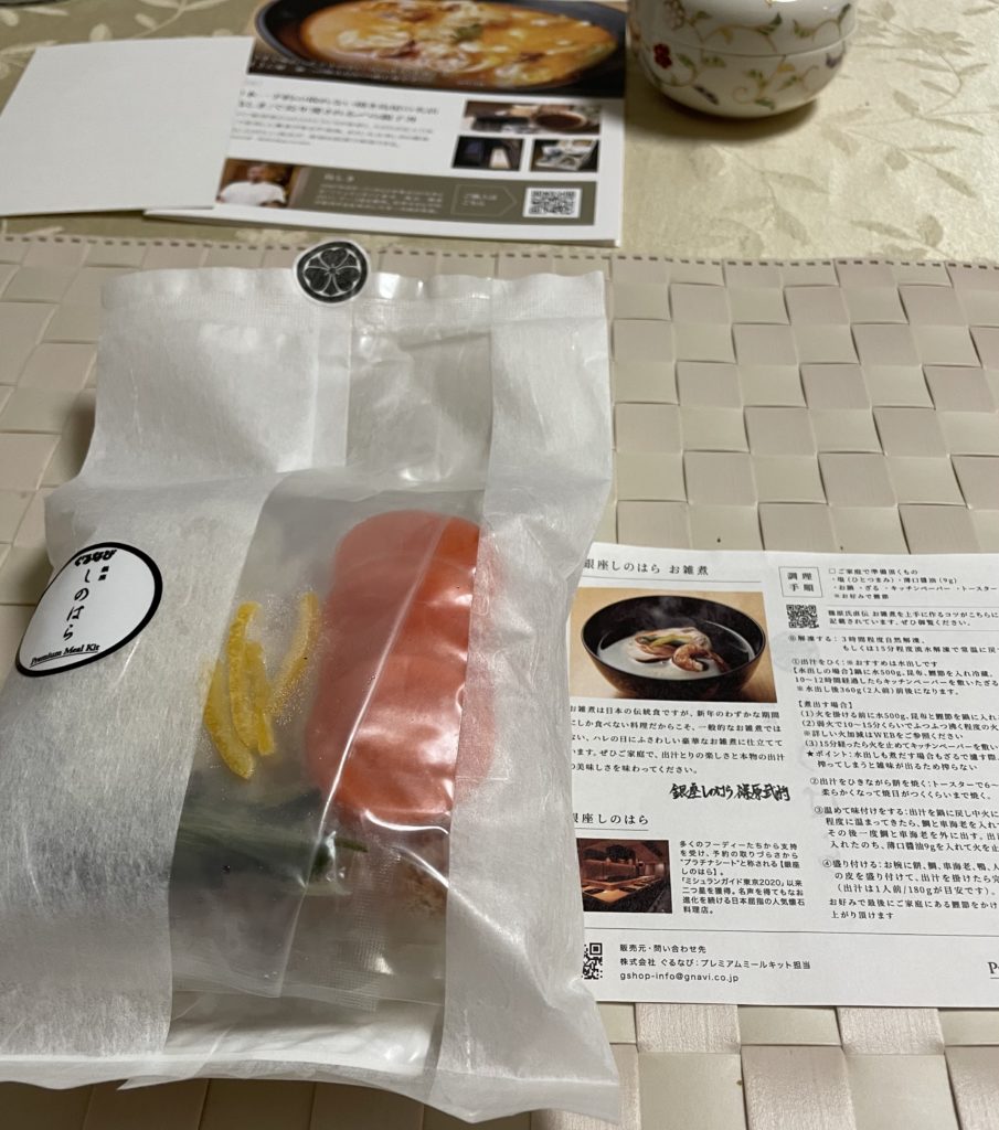 お雑煮は、銀座しのはらの調理キット使用。レトルトに比べて手数がかかるため、食卓にあげるのが延び延びになった。