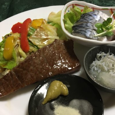 仙台牛ロースの焼肉、キャベツとピクルス炒め、しらすおろし、しめ鯖。