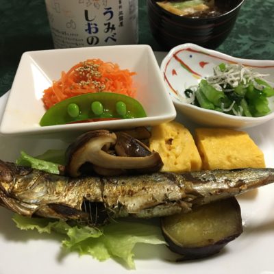 鰯の丸干し焼にレタス、椎茸炒めとさつまいも、玉子焼き、キャロットラペにエンドウ、小松菜のしらす和え。