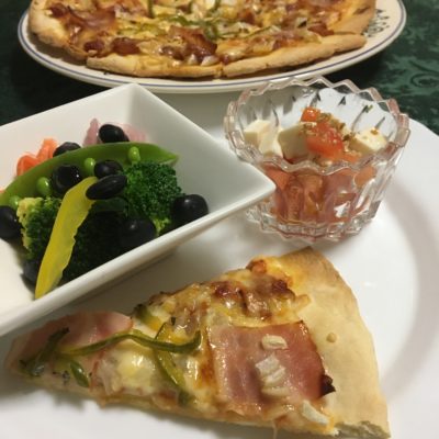手作り生地のベーコンピザ、ブロッコリーとピクルスのサラダ、豆腐とトマトの胡麻酢。