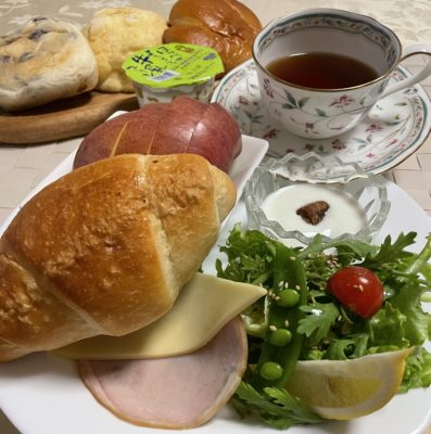 365日クッキング 2月15日の朝ごはん(春菊のサラダと丸山珈琲 信州松本ブレンド) クロワッサンにハムとゴーダスライス、春菊のサラダにプチトマトとエンドウとレモン、ヨーグルトとドライイチジク、りんご、牛乳プリン。 珈琲は丸山...