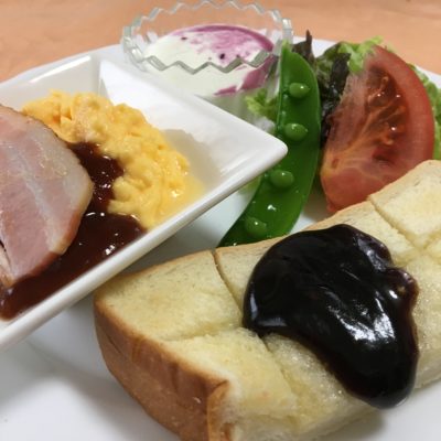 あんバタートースト、スクランブルエッグとベーコン、レタスとトマトにエンドウ、ヨーグルトにブルーベリーソース。