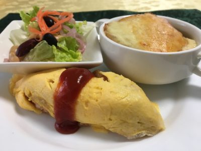 オムライス、オニオングラタンスープ、黒豆入りの野菜サラダ。
