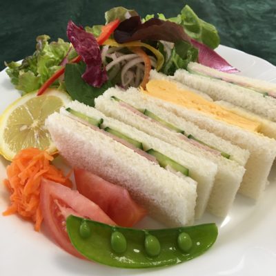ハムサンドと玉子サンド、野菜サラダにレモン、キャロットラペとトマトにエンドウ。