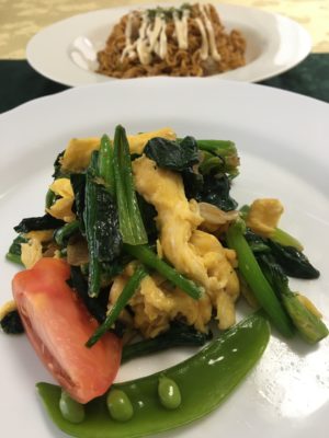 ほうれん草の玉子炒めにトマトとエンドウ、カップ焼きそば。