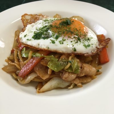 焼きそば、目玉焼き。